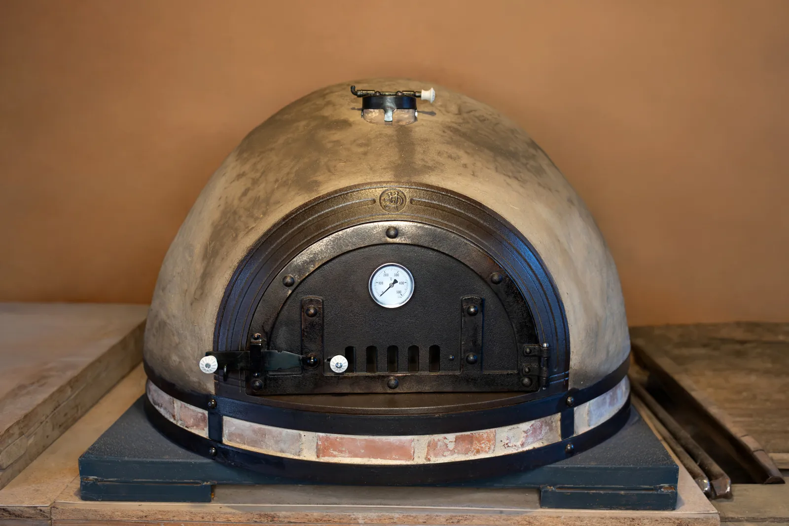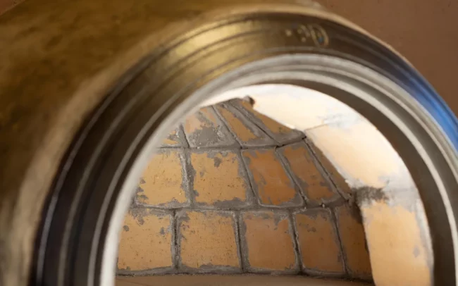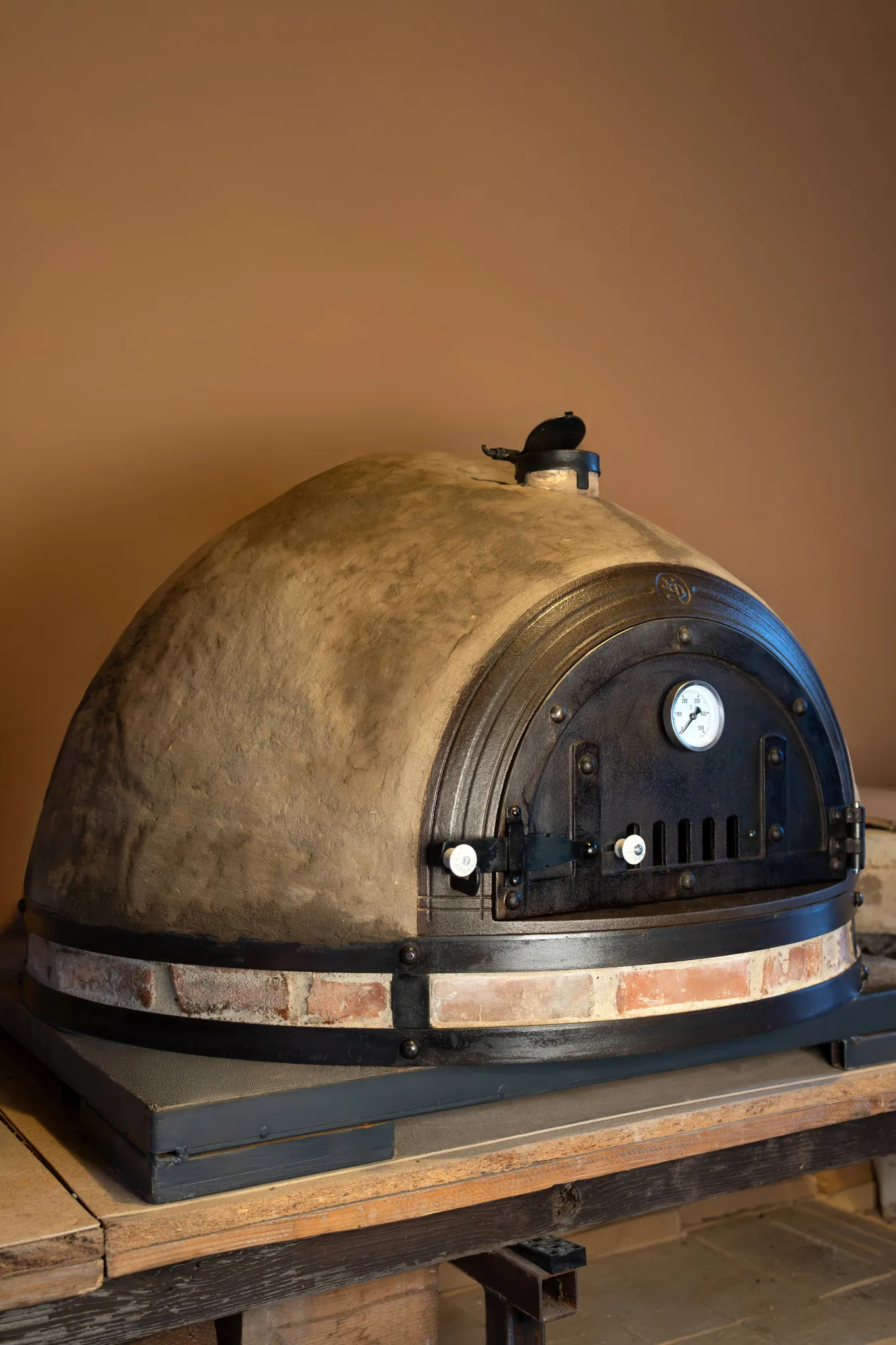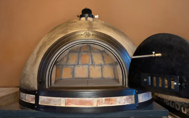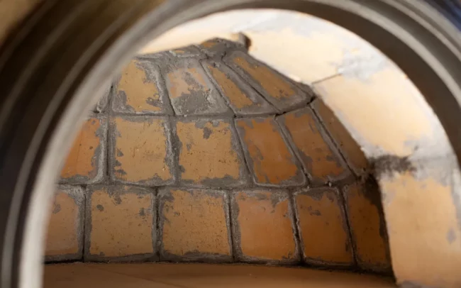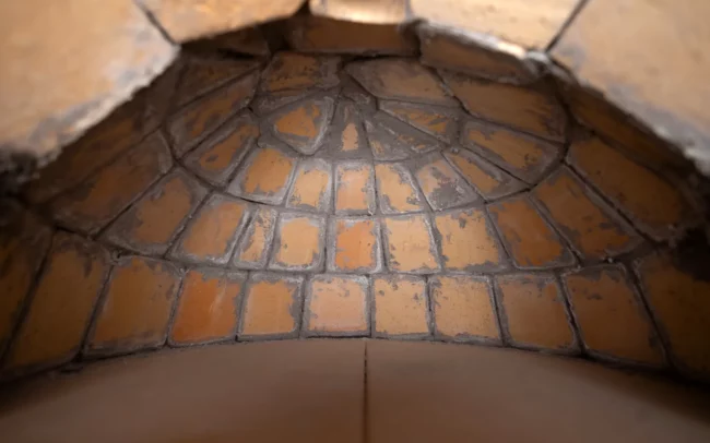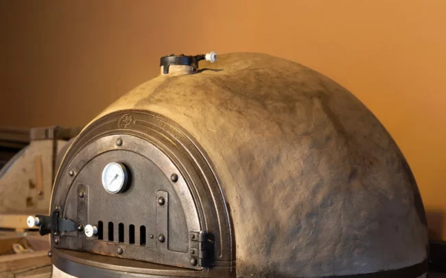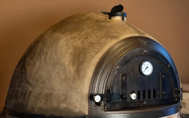 z přírodních materiálů – jílu, hlíny, slámy, křemičitého písku, vodního skla a italských keramických desek, které jsou certifikované pro styk s potravinami.